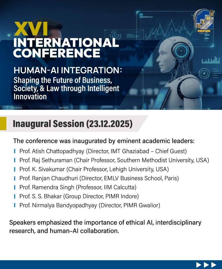 Prestige Institute of Management & Research (PIMR), Gwalior, successfully organized the 16th International Conference 2025 on 23–24 December 2025 in hybrid mode.