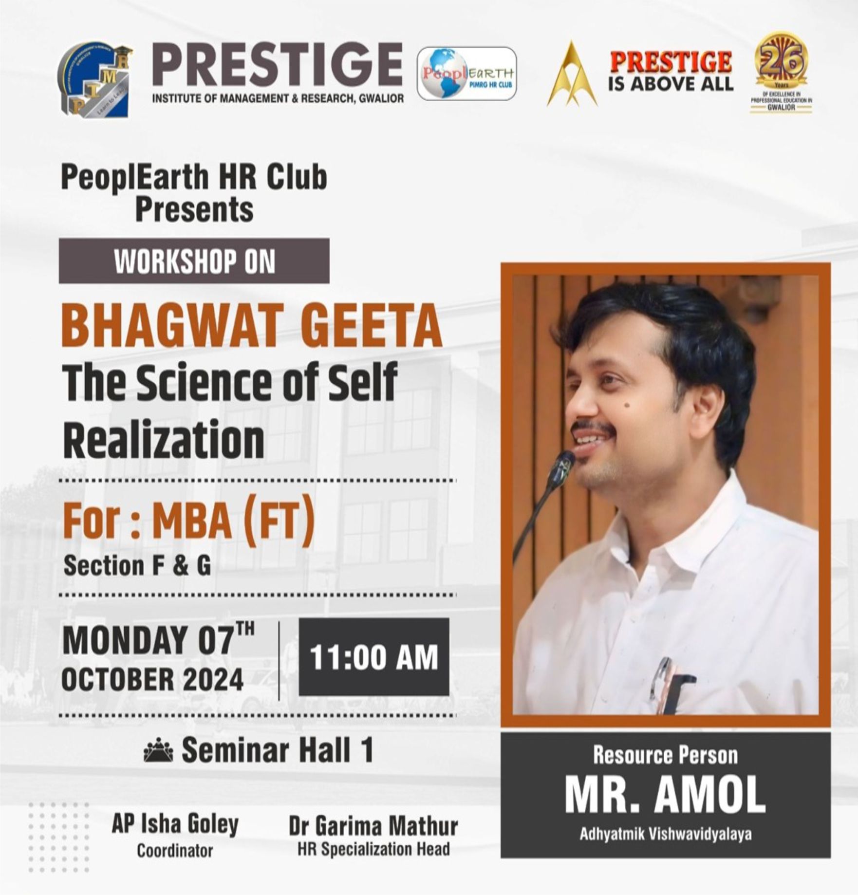 The objective of the workshop, Bhagwat Geeta: The Science of Self Realization, was to provide students with insights into the timeless teachings of the Bhagwat Geeta. The session aimed to help participants understand the essence of self-realization and apply these principles to their personal and professional lives.