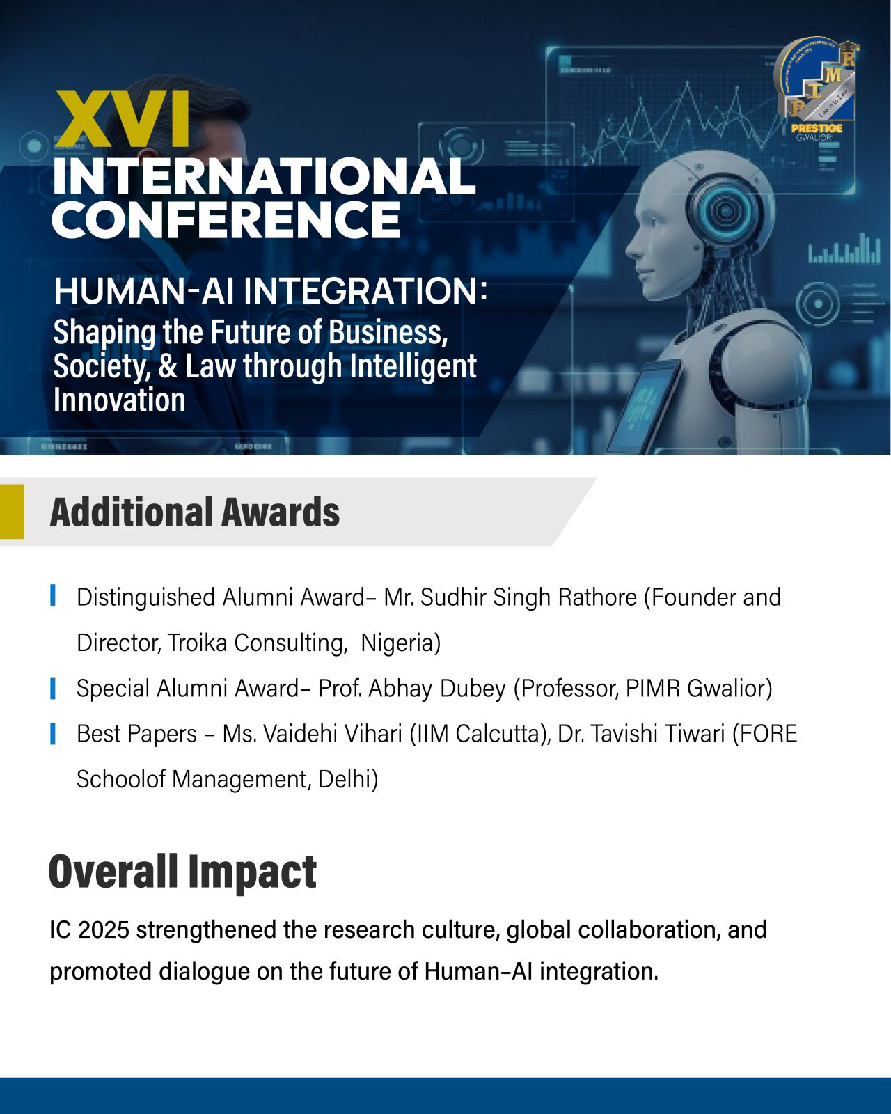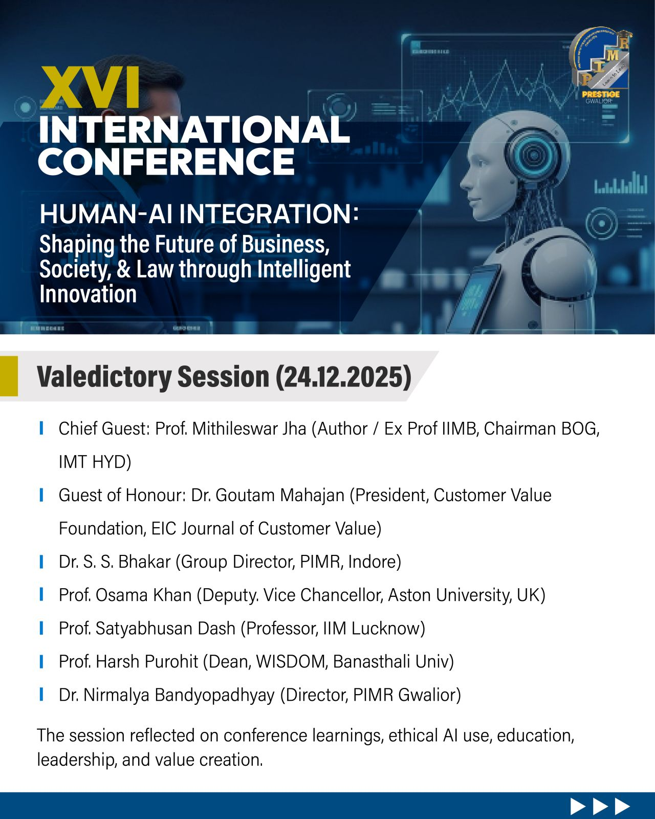 Prestige Institute of Management & Research (PIMR), Gwalior, successfully organized the 16th International Conference 2025 on 23–24 December 2025 in hybrid mode.