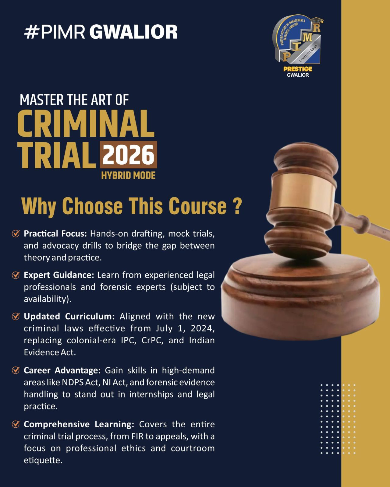 Step into the courtroom with confidence Master the art of criminal trials through hands-on learning, real case insights, and expert guidance — because tomorrow’s legal minds are shaped by today’s practice.
